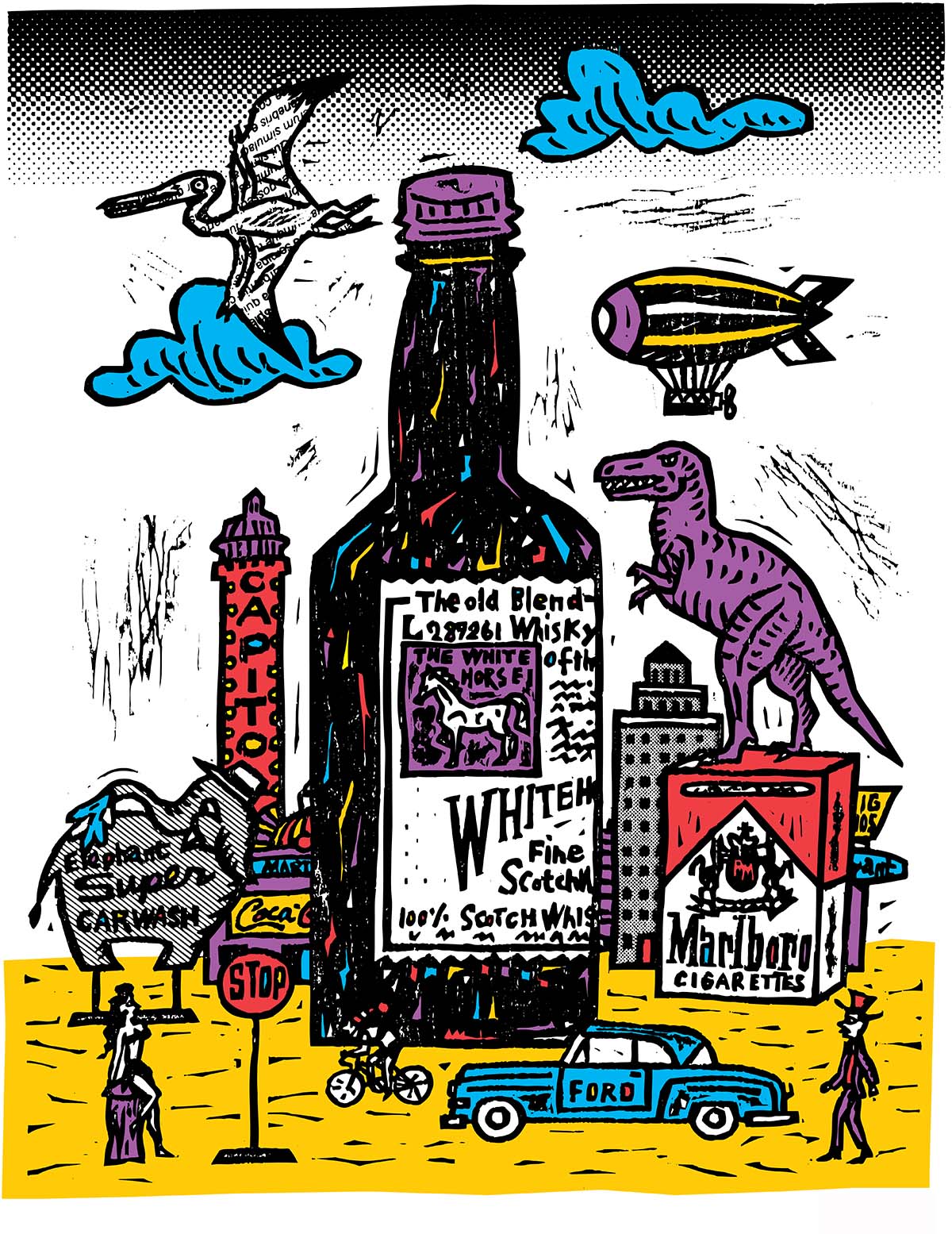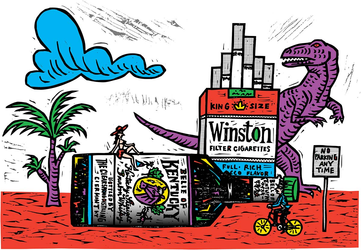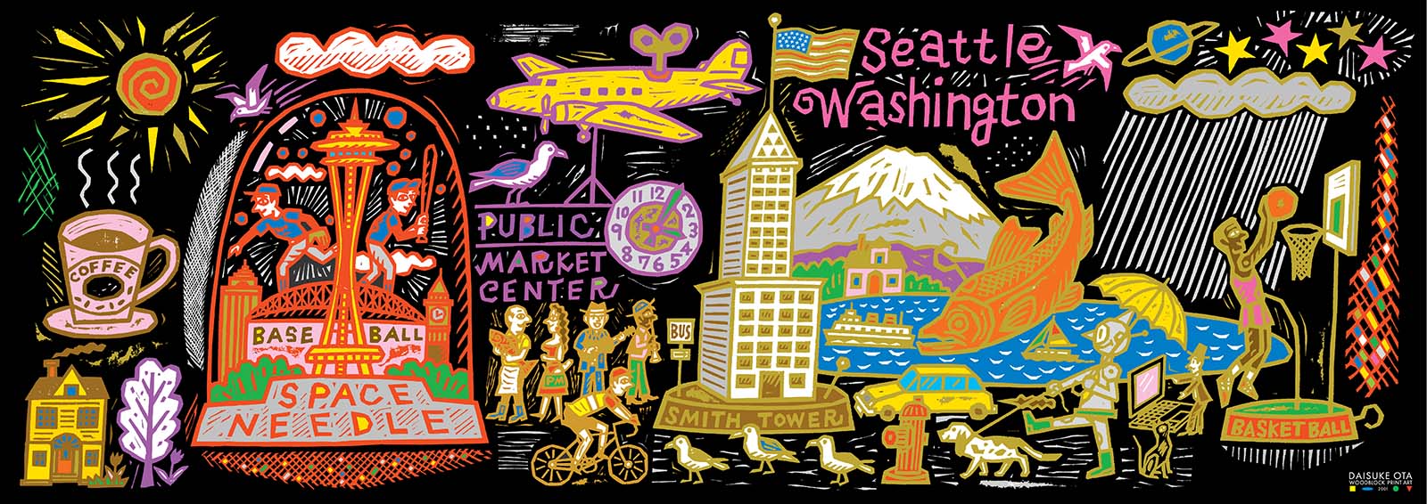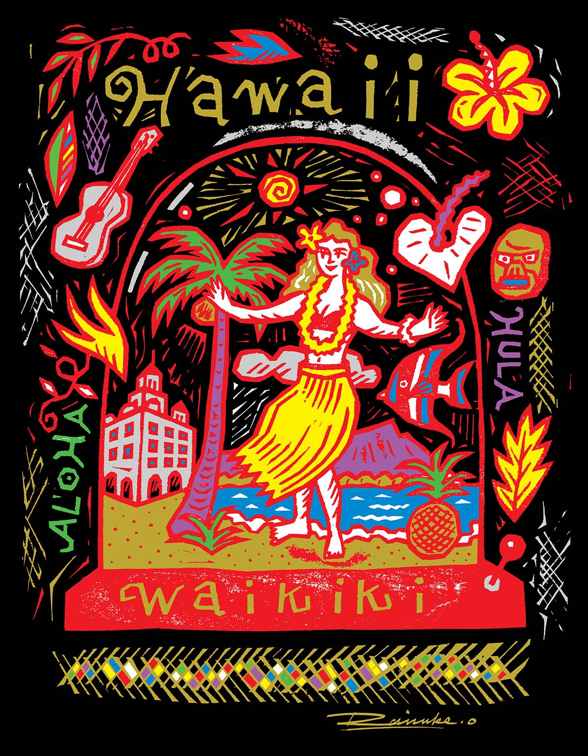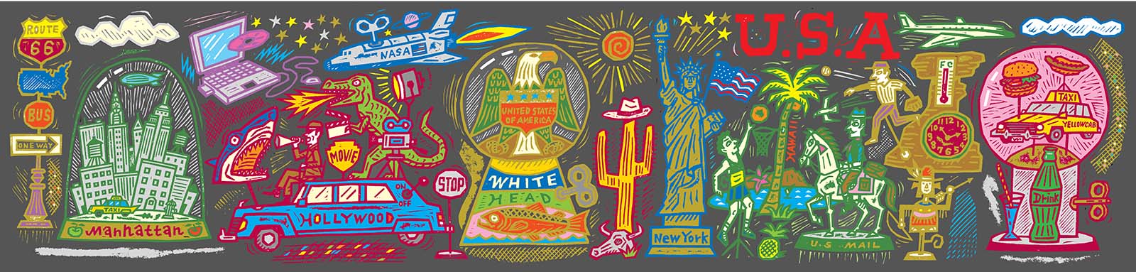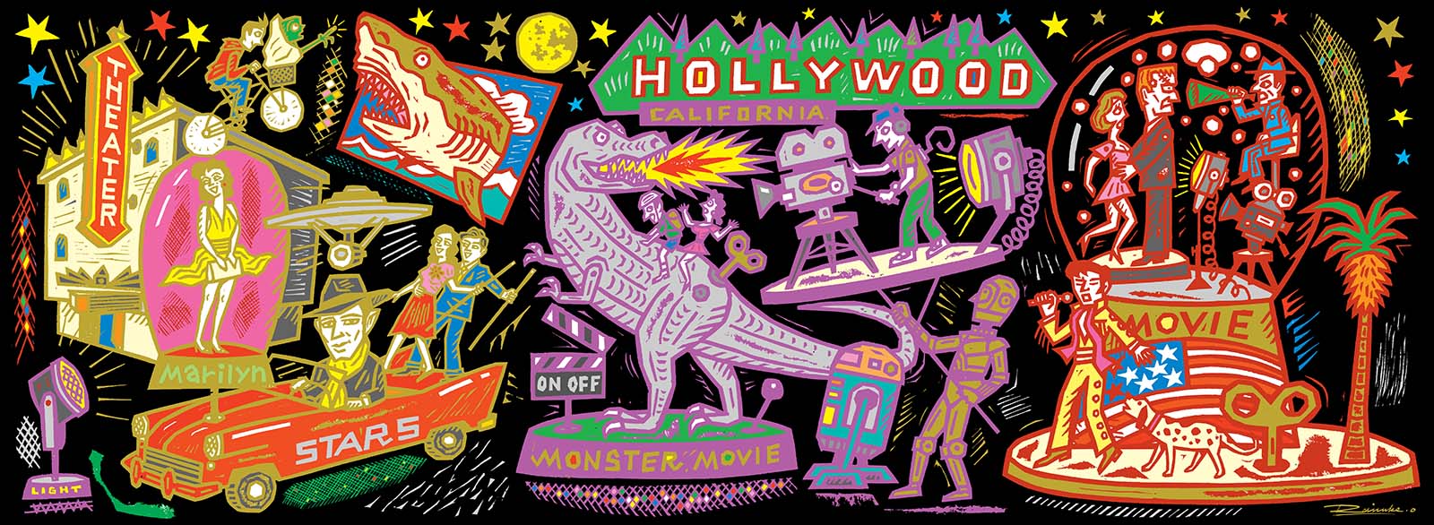 これらはアメリカンポップシリーズの木版画で、アメリカ横断旅行での印象から主に1980年代に多く作りました。モノクロ版画をデジタル化してフォトショップで色付けして出力した作品
